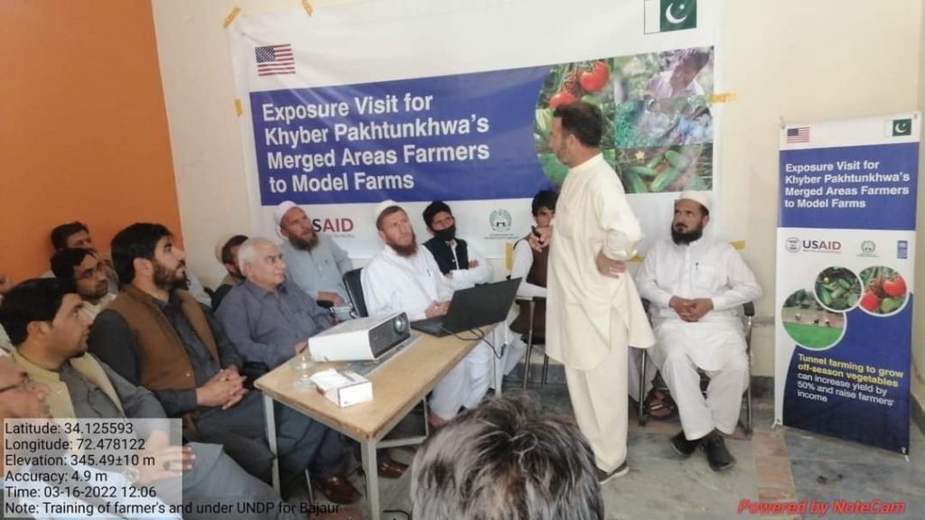 پروجیکٹ انچارج اور بعد میں ڈسٹرکٹ ڈائریکٹر باجوڑ نے پروجیکٹ کے سرگرمیوں پر روشنی ڈالتے ہوئے بتایا کہ باجوڑ کا علاقہ ٹماٹر، شملہ،اور کھیرا کی فصل کے لئے کافی موزوں ہے. جہاں ملک کے دیگر علاقوں کی نسبت ٹماٹر اور دیگر فصلوں کی پیداوار کافی زیادہ ہے جس میں اس طرح کی تربیت سے مزید بہتری لائی جا سکتی ہے. انہوں نے بتایا کہ پاکستان میں ٹماٹر کی اوسط پیداوار 9.5 ٹن فی ہیکٹر ہے اور آسٹریلیا میں 109 ٹن فی ہیکٹر جبکہ چین اور میکسیکو جیسے ممالک میں 50 ٹن فی ہیکٹر سے زیادہ پیداوار دے رہے ہیں.