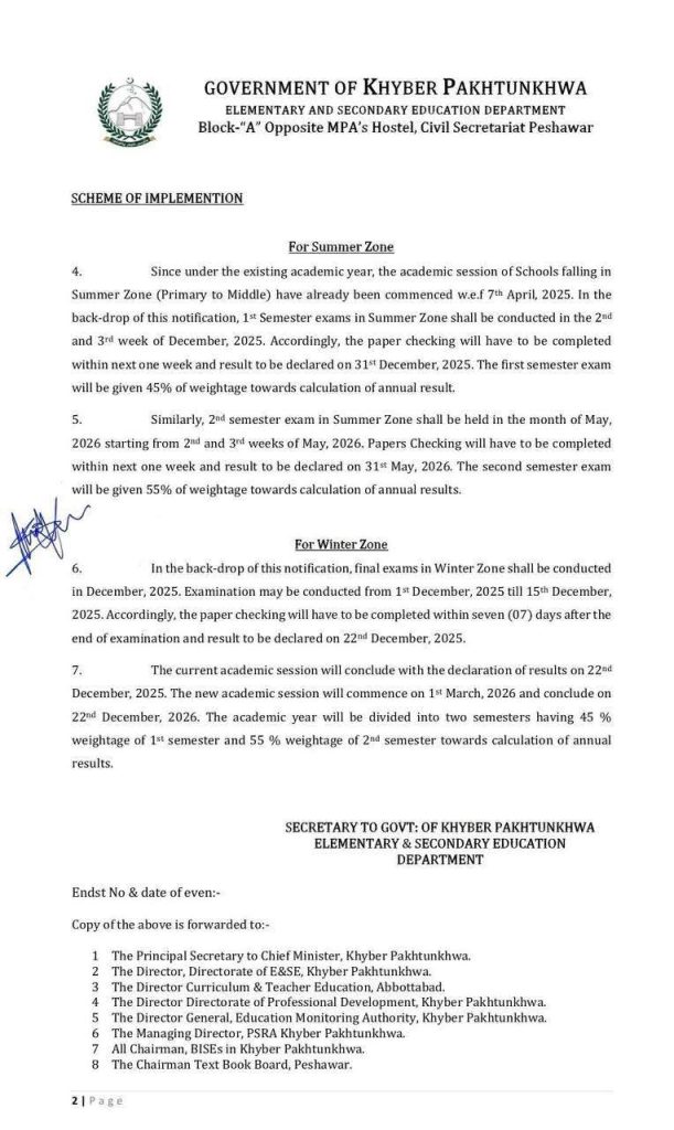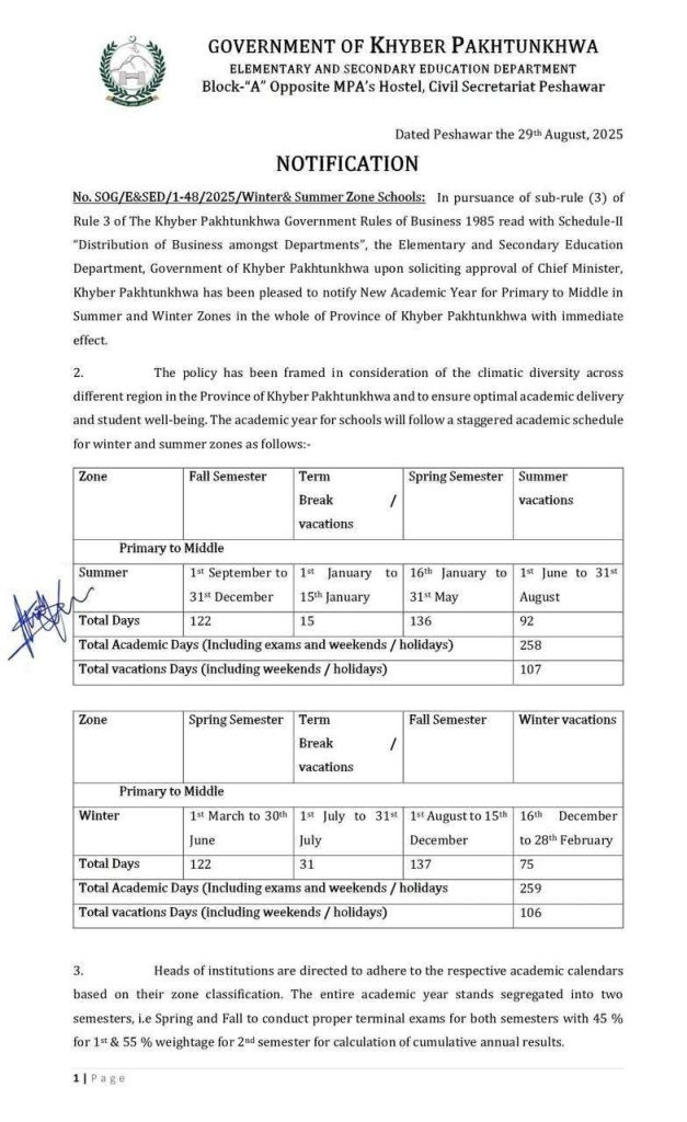 اب صوبے کے پرائمری تا مڈل اسکولوں کے لیے سمر اور ونٹر زونز کے حساب سے الگ الگ تعلیمی سال ہوں گے۔ اس پالیسی کا مقصد طلبہ کی فلاح و بہبود، معیاری تدریسی عمل اور صوبے کے مختلف موسمی حالات کو مدنظر رکھتے ہوئے بہتر تعلیمی ماحول فراہم کرنا ہے۔