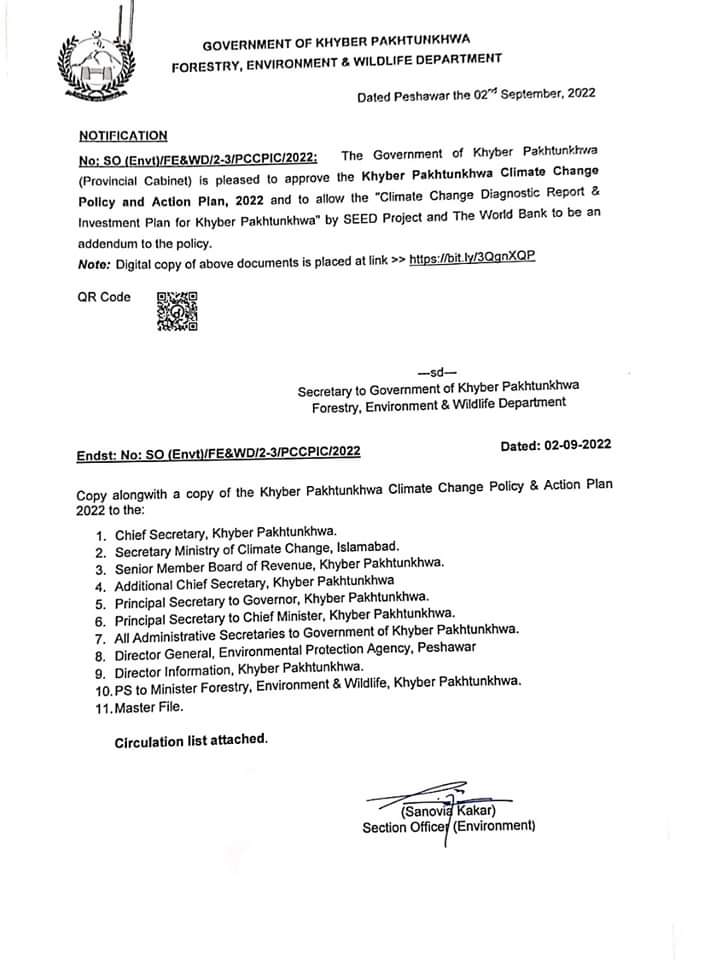 وزیراعلیٰ خیبرپختونخوا محمود خان نے موسمیاتی تبدیلی کے منفی اثرات کے موثر تدارک اور تبدیلی سے پیدا ہونے والے چیلنجز سے نمٹنے کیلئے کلائیمٹ چینج پالیسی2022 بمعہ ایکشن پلان کی منظوری دے دی ہے۔